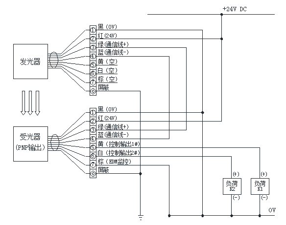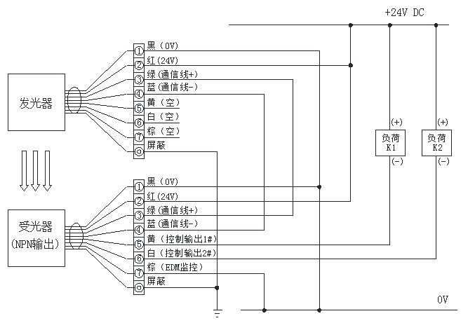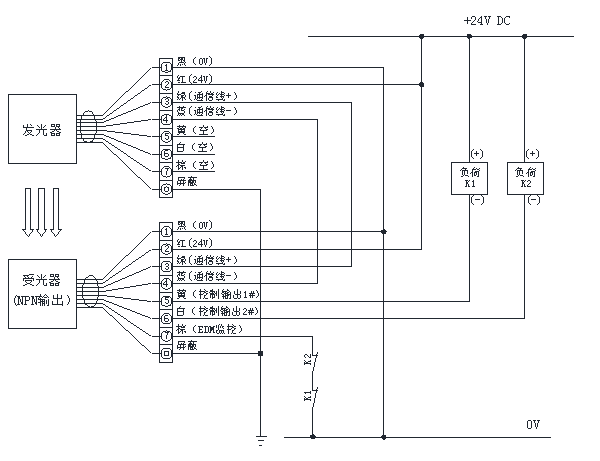 注意:若負(fù)載為帶有反向二極管的直流繼電器等,請注意極性不要接錯(cuò),否則可能損壞光幕裝置。